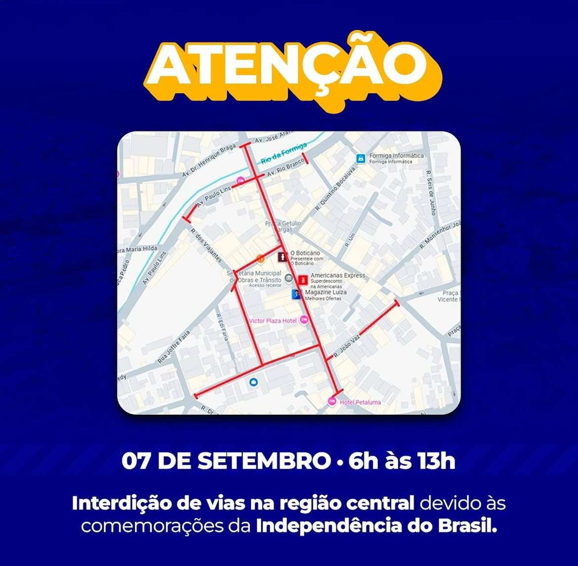 As interdições vão ocorrer das 6h às 13h, período em que será realizado o tradicional Desfile Cívico. A administração municipal pede a compreensão da população e orienta os motoristas a redobrarem a atenção ao trafegar próximo ao local do evento.