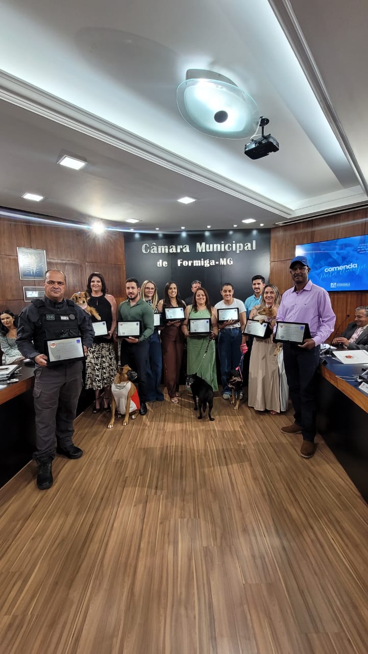 A Câmara Municipal de Formiga realizou, nessa segunda-feira (20), a solene entrega da Comenda Pata Amiga, homenagem instituída pela Lei Municipal nº 6.058/2023, de autoria da vereadora Joice Alvarenga, destinada a pessoas que se destacam na defesa, cuidado e proteção dos animais no município.