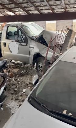 O impacto causou grandes danos materiais, destruindo completamente a varanda da casa e atingindo também um veículo que estava estacionado no interior da garagem.