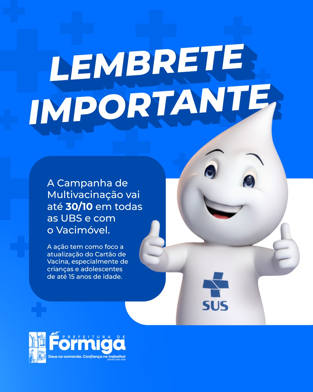 A Prefeitura de Formiga, por meio da Secretaria Municipal de Saúde, informa que a Campanha de Multivacinação segue acontecendo em todas as Unidades Básicas de Saúde do município e também com o Vacimóvel, até o dia 30 de outubro.