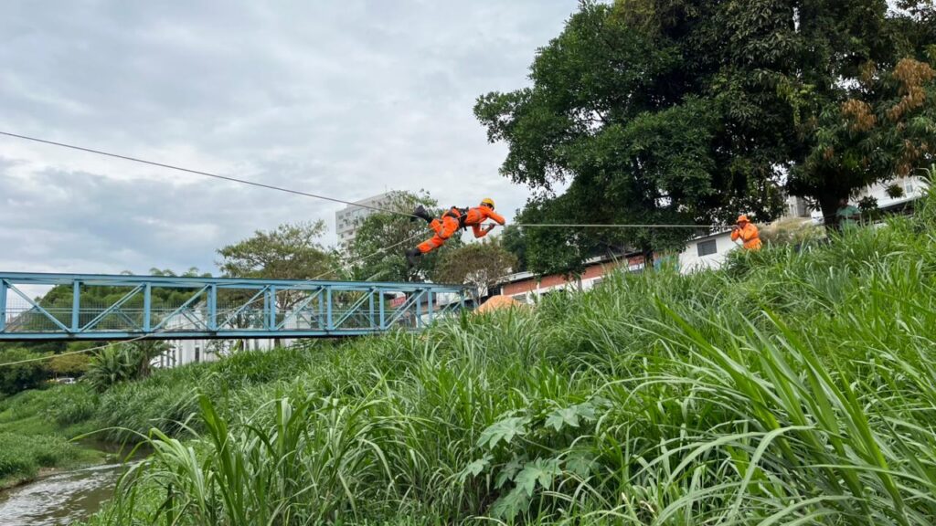 O exercício simulou um cenário de isolamento de vítimas por enxurrada, permitindo aos bombeiros o treinamento de táticas de aproximação, estabilização e retirada segura de pessoas em áreas de risco.