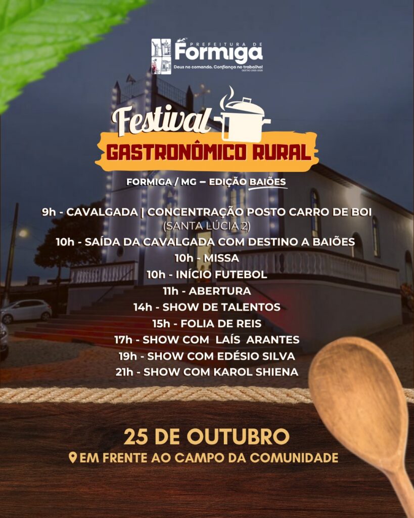 O distrito de Baiões será palco de mais uma edição do Festival Gastronômico Rural de Formiga, que acontecerá neste sábado (25), em frente ao campo da comunidade. O evento promete reunir boa comida, cultura e muita música, celebrando as tradições rurais do município.