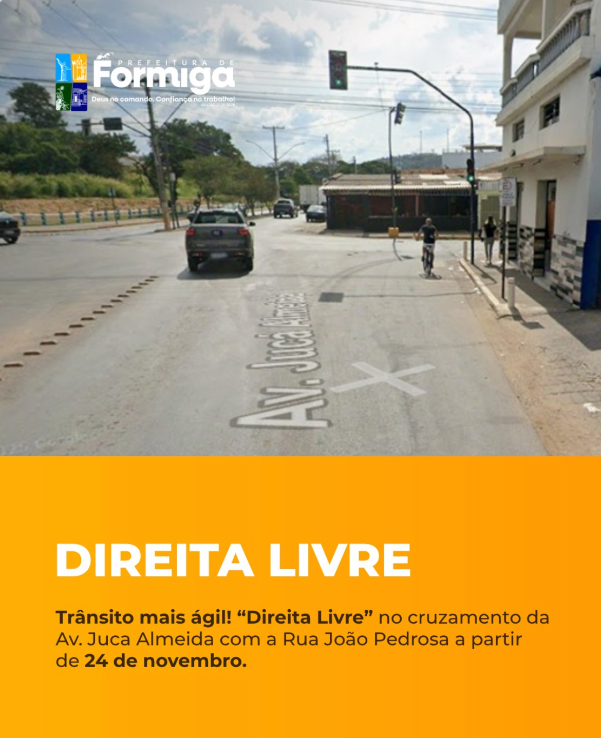 A Prefeitura de Formiga, por meio da Superintendência Municipal de Trânsito, informa que a implantação da sinalização de “Direita Livre” no cruzamento entre a Avenida Juca Almeida e a Rua João Pedrosa será realizada a partir do dia 24 de novembro.