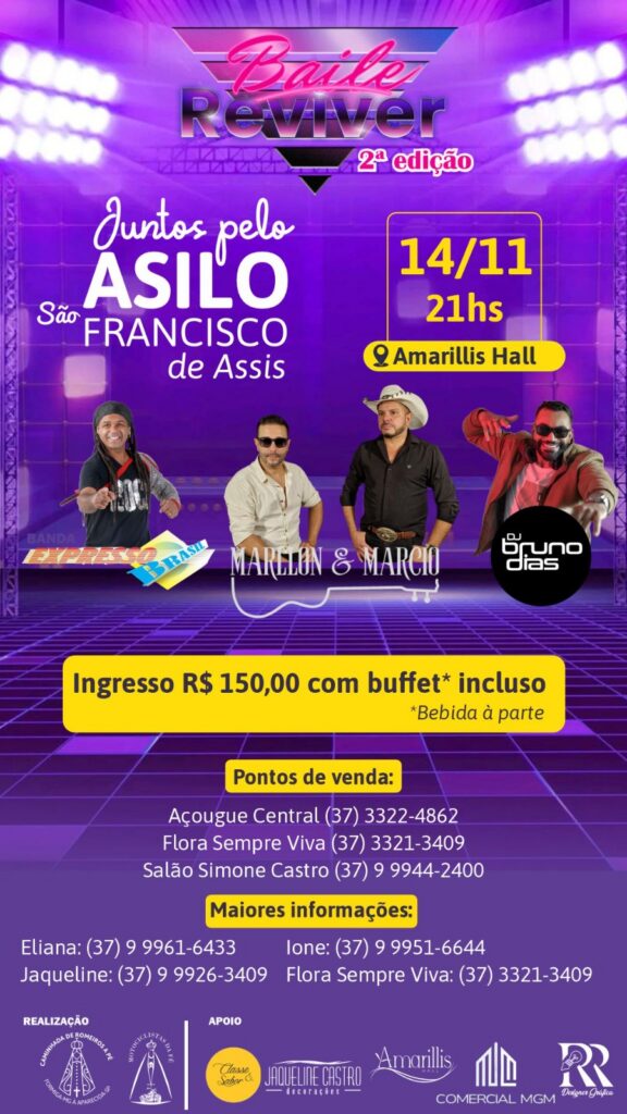 Com o lema “Juntos pelo Asilo São Francisco de Assis”, o baile promete reunir a comunidade em torno de uma causa nobre, oferecendo uma noite de muita diversão com shows ao vivo e ambiente aconchegante. As atrações confirmadas incluem a banda Expresso Brasil, a dupla Marllon & Márcio e o DJ Bruno Dias, garantindo uma programação musical diversificada que vai embalar a pista até altas horas.