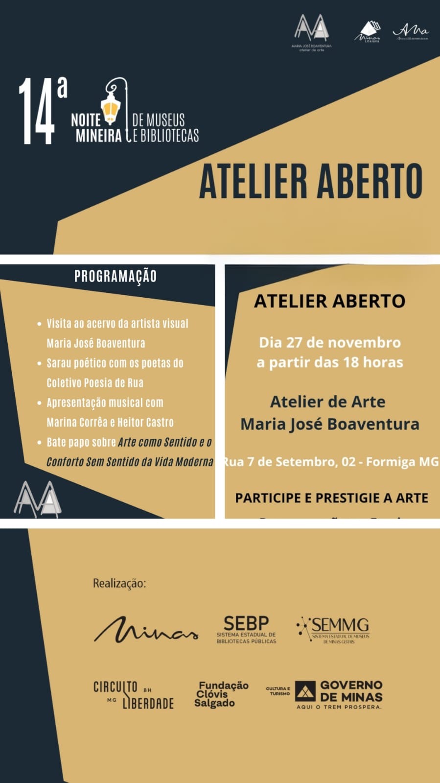 O Atelier de Arte Maria José Boaventura participa, nesta quinta-feira (27), da 14ª edição da Noite Mineira de Museus e Bibliotecas, iniciativa promovida pela Secretaria de Estado de Cultura e Turismo de Minas Gerais, pelo Sistema Estadual de Museus (SEMMG) e pelo Sistema Estadual de Bibliotecas Públicas (SEBP).