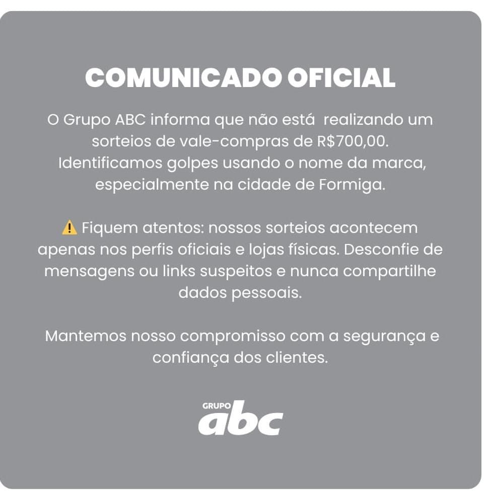 O Grupo ABC emitiu um comunicado oficial alertando clientes de Formiga sobre um golpe que vem sendo disseminado utilizando o nome e a imagem da rede. Criminosos estão enviando mensagens informando falsos sorteios de vales-compras no valor de R$ 700, direcionando as vítimas para links suspeitos e exigindo dados pessoais.