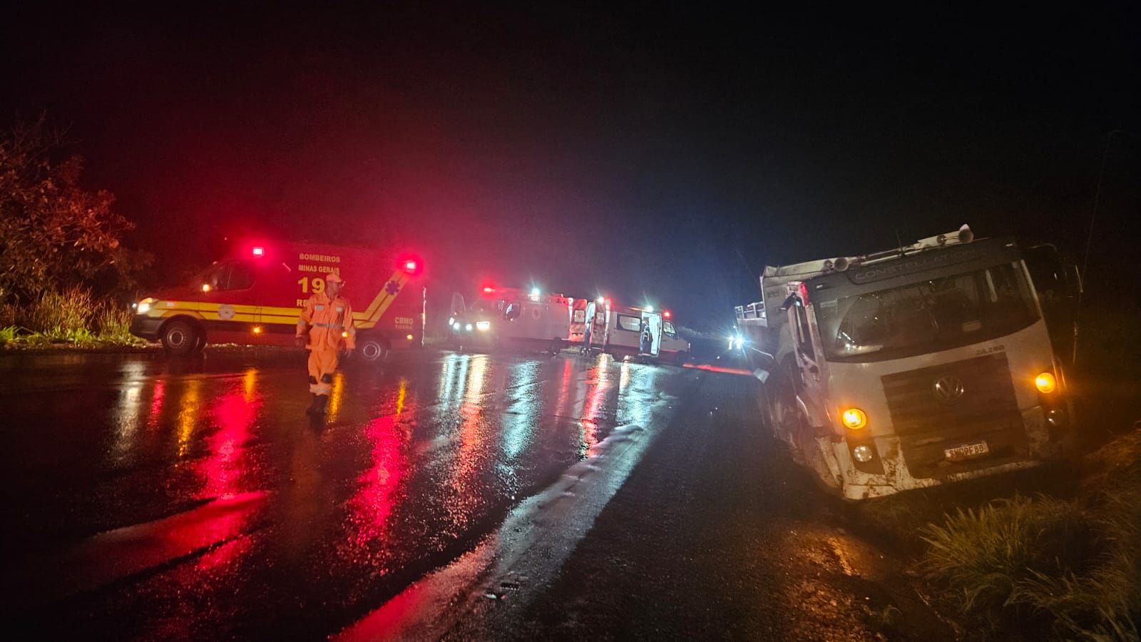 A corporação informou que o caminhão saiu da pista e parou no acostamento. Devido às chuvas, à curva acentuada e à baixa visibilidade, os bombeiros precisaram interditar totalmente as faixas da rodovia para garantir a segurança da operação.