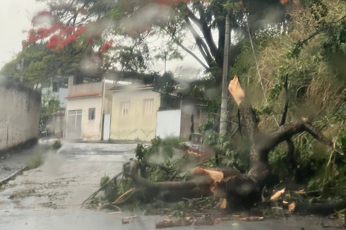 Segundo informações iniciais, a árvore caiu após as fortes chuvas que atingiram o município ao longo do dia. As equipes seguem monitorando a situação.