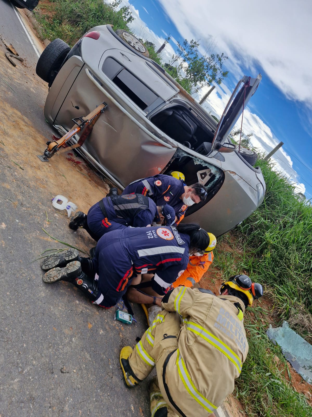 O atendimento pré-hospitalar foi realizado de forma integrada entre o Samu e o Corpo de Bombeiros Militar. Durante a ocorrência, constatou-se que a vítima do sexo masculino encontrava-se retida no interior do veículo, sendo necessária a intervenção da guarnição do CBMMG, que realizou a retirada da vítima por meio de técnicas adequadas de salvamento veicular.