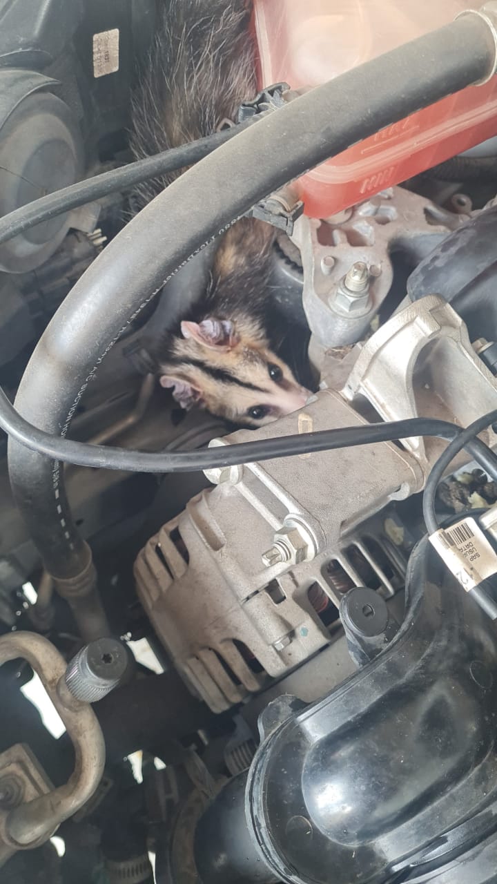 Um gambá foi resgatado pelo Corpo de Bombeiros na manhã dessa sexta-feira (5) após ficar preso no motor de um veículo no Centro de Formiga. O chamado ocorreu por volta das 11h25, quando a proprietária do automóvel percebeu que não conseguia retirá-lo para sair com o carro.