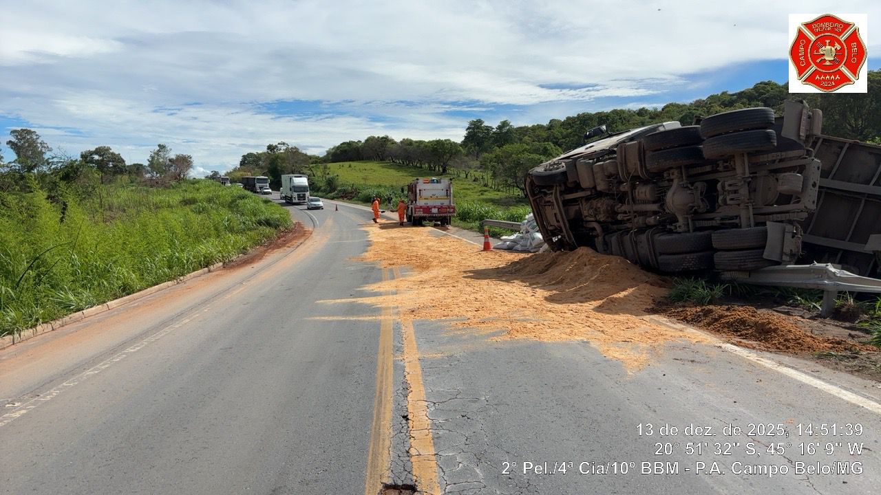 Um tombamento de carreta causou derramamento de óleo na pista e bloqueou uma faixa da BR-354, no km 556, em Campo Belo, na tarde deste sábado (13). A ocorrência foi registrada por volta das 14h02 e ofereceu risco de derrapagem aos motoristas.