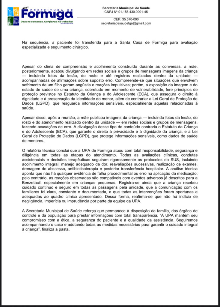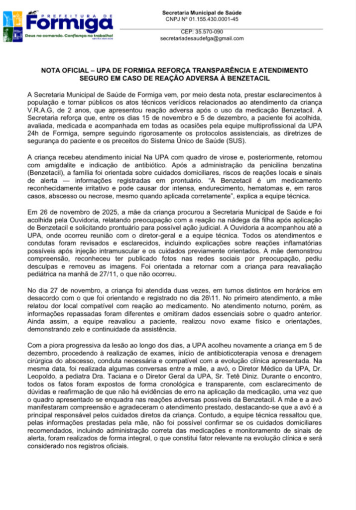Uma nota oficial da Secretaria Municipal de Saúde de Formiga foi divulgada nesta sexta-feira (5) para esclarecer os procedimentos realizados no atendimento de uma criança de 2 anos, V.R.A.G., que apresentou uma reação adversa após receber a medicação Benzetacil (penicilina benzatina) na UPA 24h.