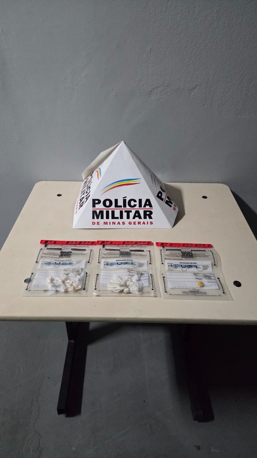 Dando continuidade às diligências, os policiais encontraram, nas proximidades, duas porções adicionais de cocaína, um comprimido de ecstasy e onze pedras de substância análoga ao crack, todas prontas para comercialização.