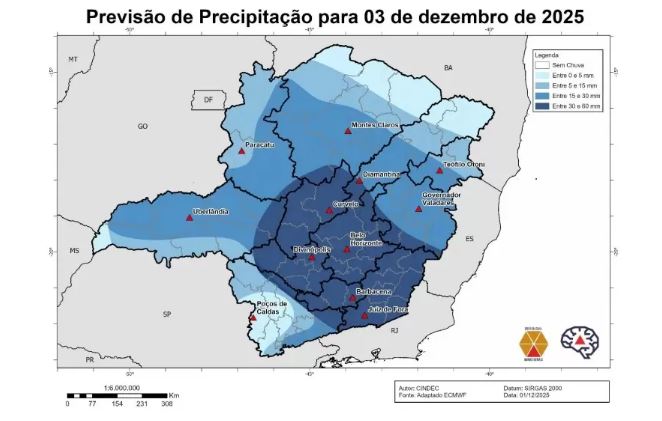 Ao longo do dia, com o aumento da instabilidade, são previstas chuvas intensas e a ocorrência de tempestades em todo o estado, que podem vir acompanhadas de rajadas de vento de até 70 km/h e queda ocasional de granizo, especialmente no Centro-Leste. Os acumulados pluviométricos podem ficar em torno de 60 mm.