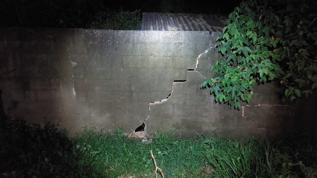 Durante a verificação no local, os bombeiros confirmaram que o problema se agravou de forma significativa após as fortes chuvas que atingiram o município na última sexta-feira (23). Além das fendas abertas, a equipe identificou o surgimento de buracos na estrutura, sinais que indicam que a terra está se movimentando e que o muro pode vir a cair.
