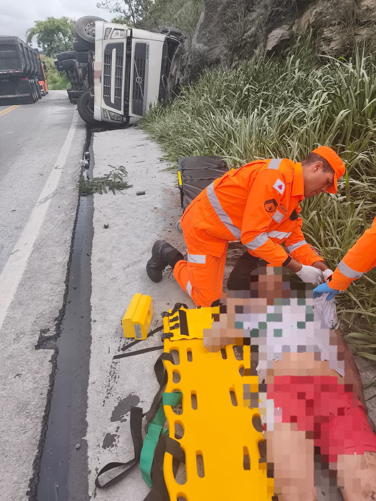 A vítima, condutor do caminhão, do sexo masculino, 54 anos, encontrava-se fora do veículo, em decúbito dorsal no acostamento, tendo sido retirada do interior do caminhão por um motorista que parou para prestar auxilio no momento do acidente. A vítima apresentava-se consciente e orientada, queixando-se de dor intensa em região cervical, além de escoriações nos braços e na perna esquerda, bem como suspeita de fratura no braço esquerdo.