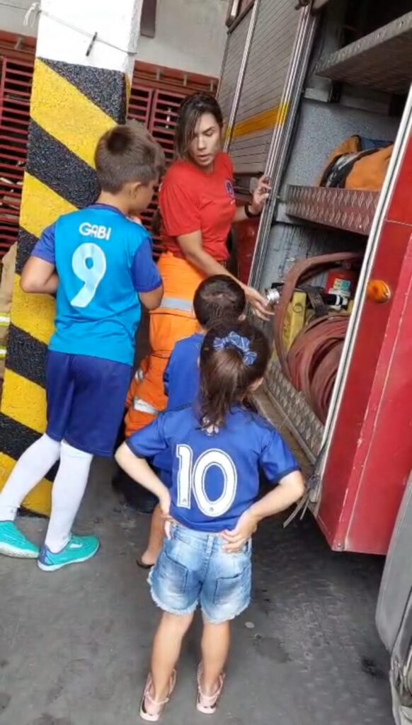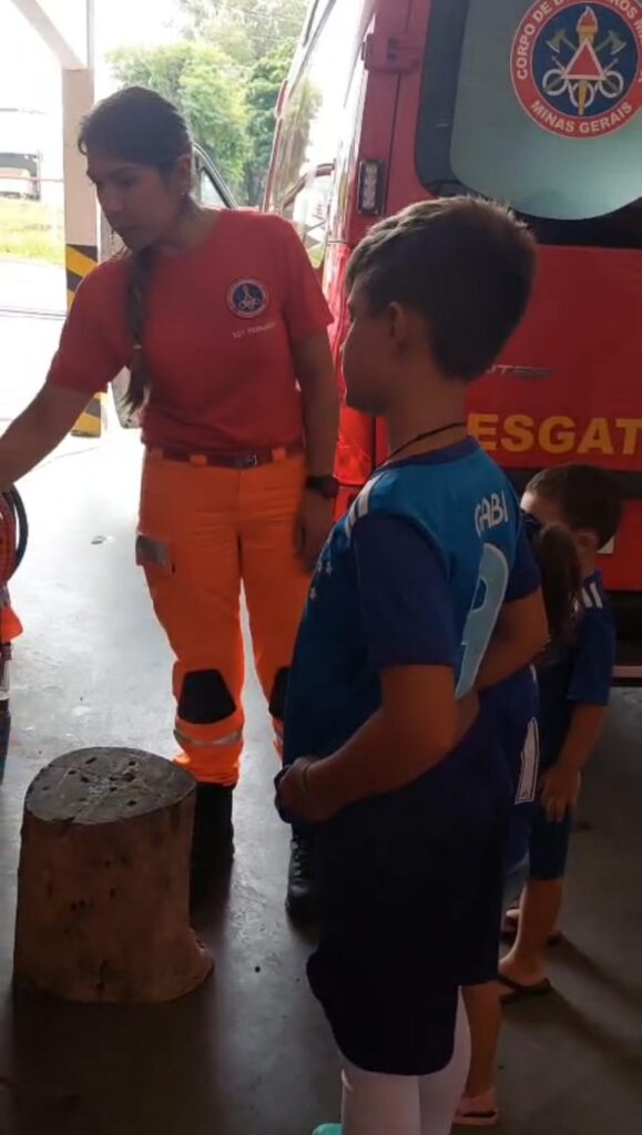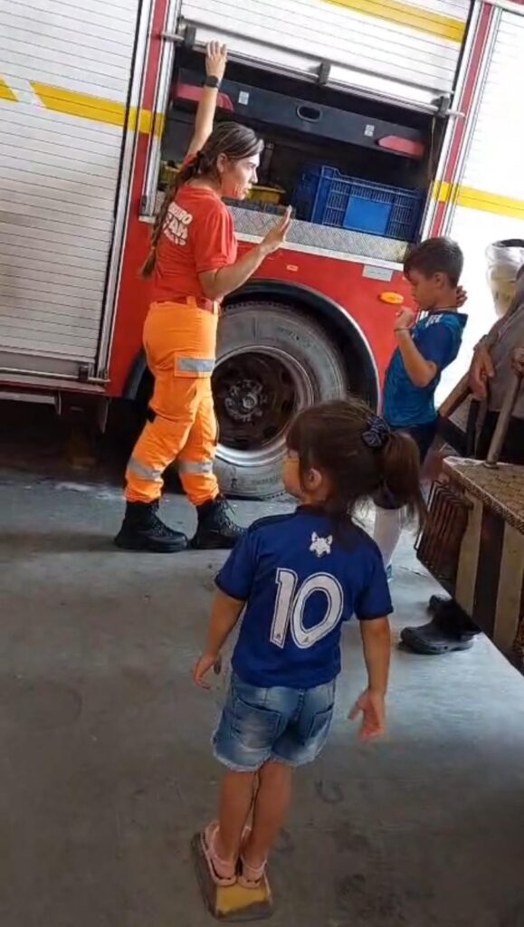 Durante a visita, os militares apresentaram algumas das principais atividades desenvolvidas no dia a dia da corporação, demonstrando equipamentos, viaturas e procedimentos operacionais, sempre com foco na segurança e na prevenção. O momento mais aguardado pelas crianças foi a entrada na viatura ABTS – Auto Bomba Tanque Salvamento, viatura de emprego múltiplo amplamente utilizada no atendimento às ocorrências.