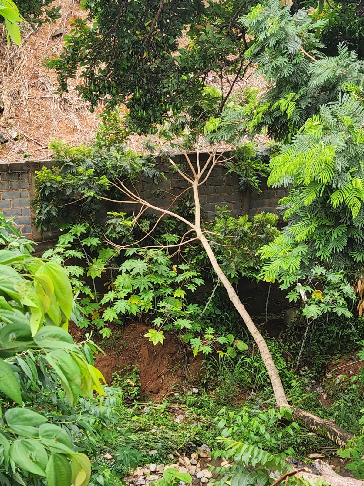 No local, os militares constataram que a árvore caiu em decorrência do cedimento de um barranco, localizado na margem oposta de um córrego. Com a queda, a copa da árvore atingiu o muro dos fundos de uma residência, porém não houve registro de vítimas nem de danos estruturais imediatos ao imóvel.