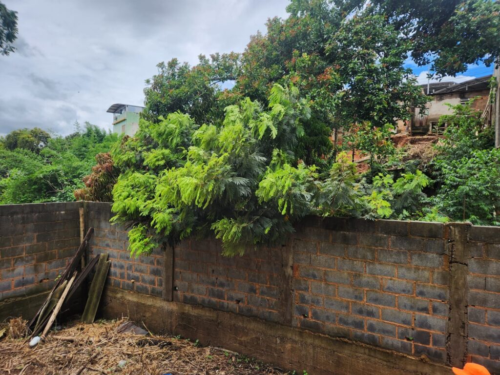 Após avaliação técnica, a equipe optou pela poda dos galhos que avançavam sobre a área da residência, mantendo o tronco apoiado sobre o muro. A supressão total da árvore não foi realizada, uma vez que o corte completo poderia provocar a queda do tronco dentro do córrego, oferecendo risco de obstrução do fluxo de água, especialmente diante da previsão de novas chuvas.