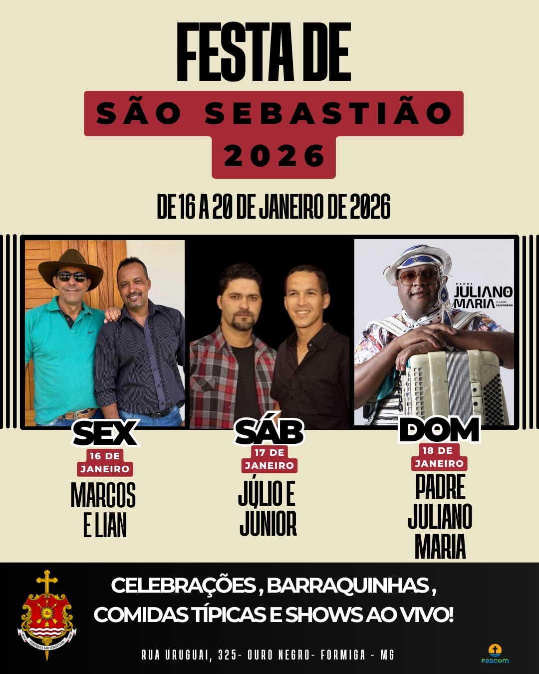 A Paróquia São Sebastião de Formiga realiza, entre os dias 16 e 20 de janeiro de 2026, a tradicional Festa de São Sebastião, reunindo momentos de fé, celebração e confraternização para a comunidade.