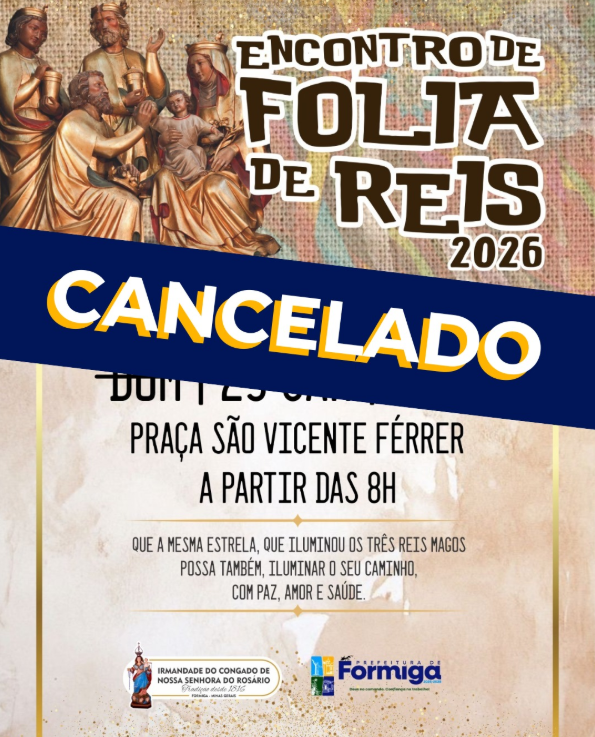 A Prefeitura de Formiga, por meio da Secretaria Municipal de Cultura, informa que o Encontro de Folia de Reis, previsto para este domingo (25), na Praça São Vicente Férrer, foi cancelado em razão das chuvas registradas no município.