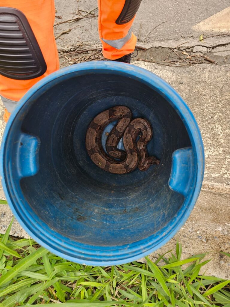 Diante do cenário, a área foi mantida sob controle e a equipe realizou a captura do animal, utilizando técnicas e equipamentos adequados para o manejo seguro de serpentes.