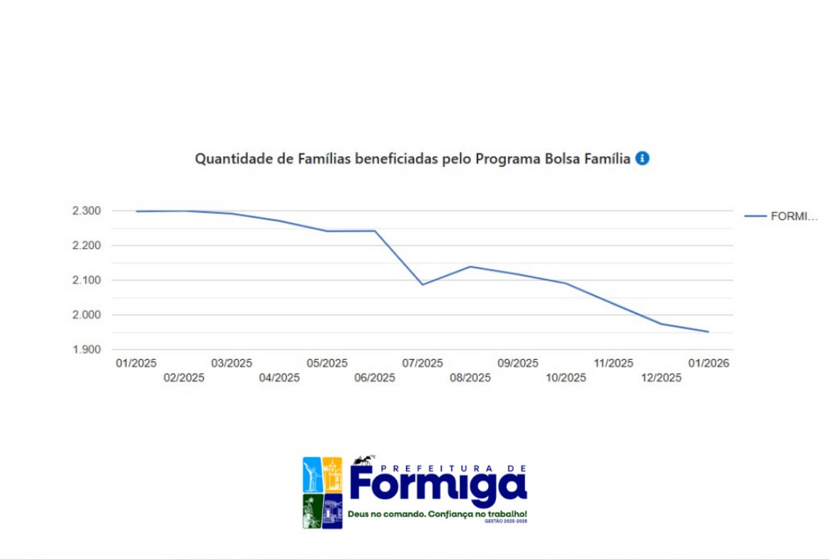 A Prefeitura de Formiga, por meio da Secretaria Municipal de Desenvolvimento Humano, registrou uma redução significativa no número de famílias atendidas pelo Programa Bolsa Família entre janeiro de 2025 e janeiro de 2026. No período, cerca de 400 famílias, em média, deixaram de receber o benefício no município.