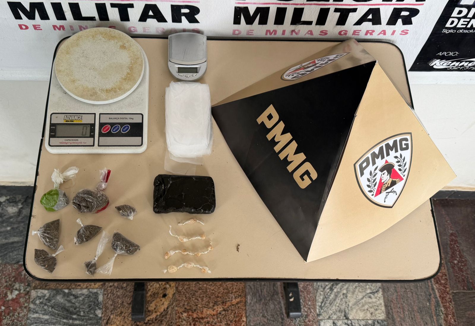 No decorrer da ação, foram localizados dinheiro, oito pedras de substância análoga ao crack, um tablete de substância análoga ao haxixe, oito buchas de substância análoga à maconha e duas balanças de precisão, comumente utilizadas para a pesagem de entorpecentes.