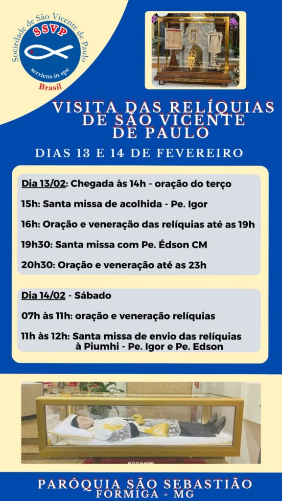 A Paróquia São Sebastião, em Formiga, recebe nos dias 13 e 14 de fevereiro as Relíquias de São Vicente de Paulo, vindas de Nápoles, na Itália. O evento celebra os 400 anos da Congregação da Missão e integra a programação devocional na Diocese de Luz. O relicário, considerado um tesouro inestimável para a espiritualidade vicentina, abriga uma relíquia de primeiro grau (uma parte do osso da costela do santo) e relíquias de segundo grau, que incluem um fragmento de veste litúrgica e uma carta original escrita por ele em 1630.