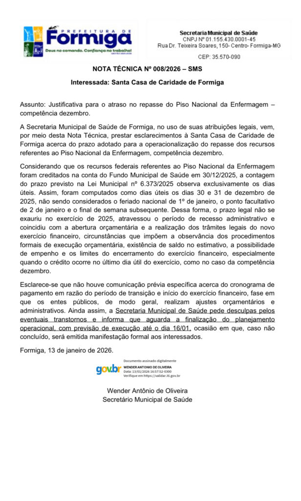 De acordo com o documento, os recursos federais destinados ao pagamento do piso da enfermagem foram creditados na conta do Fundo Municipal de Saúde no dia 30 de dezembro de 2025. A Secretaria explica que, conforme a Lei Municipal nº 6.373/2025, a contagem do prazo para o repasse considera apenas dias úteis, o que fez com que o prazo legal atravessasse o recesso administrativo e coincidisse com a abertura do novo exercício financeiro de 2026.