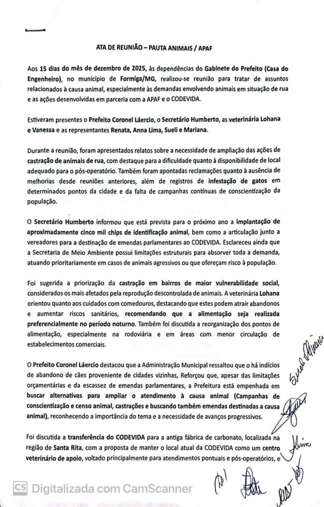 O portal Informe Centro-Oeste solicitou acesso à ata da reunião (Veja abaixo) que ocorreu no Gabinete do Prefeito de Formiga (Casa do Engenheiro) e tratou de pautas relacionadas à causa animal no município, com destaque para a retirada dos comedouros atualmente instalados no Terminal Rodoviário, além de ações voltadas ao controle populacional de animais em situação de rua e à reorganização do atendimento do CODEVIDA.