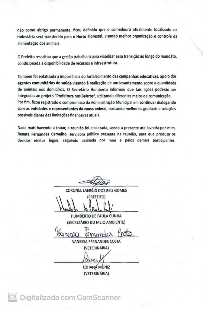 Participaram do encontro o prefeito Coronel Laércio dos Reis Gomes, o secretário municipal de Meio Ambiente Humberto de Paula Cunha, as veterinárias Lohana Muniz e Vanessa Fernandes Costa, além das representantes da causa animal Ana Karine de Lima Vasconcelos, Renata Mesquita Batista Soares, Mariana Rosa Oliveira e Sueli de Oliveira. A ata foi lavrada por Renata Fernandes Carvalho, servidora pública presente na reunião.
