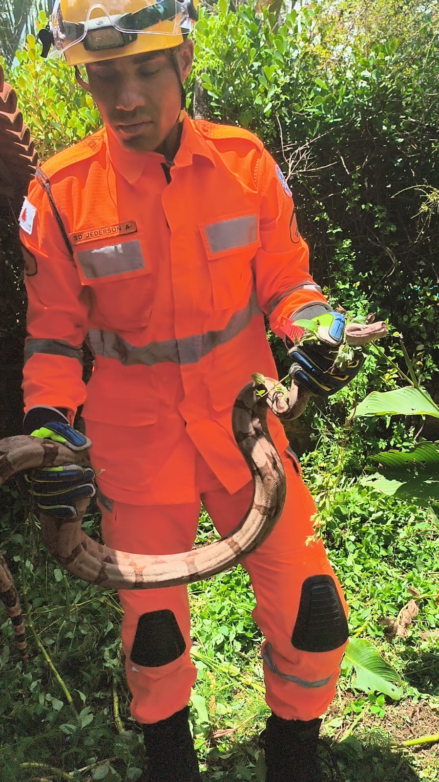 No local, a guarnição constatou a presença de uma serpente da espécie jiboia (Boa constrictor), sem lesões aparentes, medindo aproximadamente 1,50 metro de comprimento. O animal encontrava-se enrolado sob uma chapa metálica, em meio à vegetação rasteira densa, ao lado da varanda da residência, oferecendo risco potencial aos moradores.
