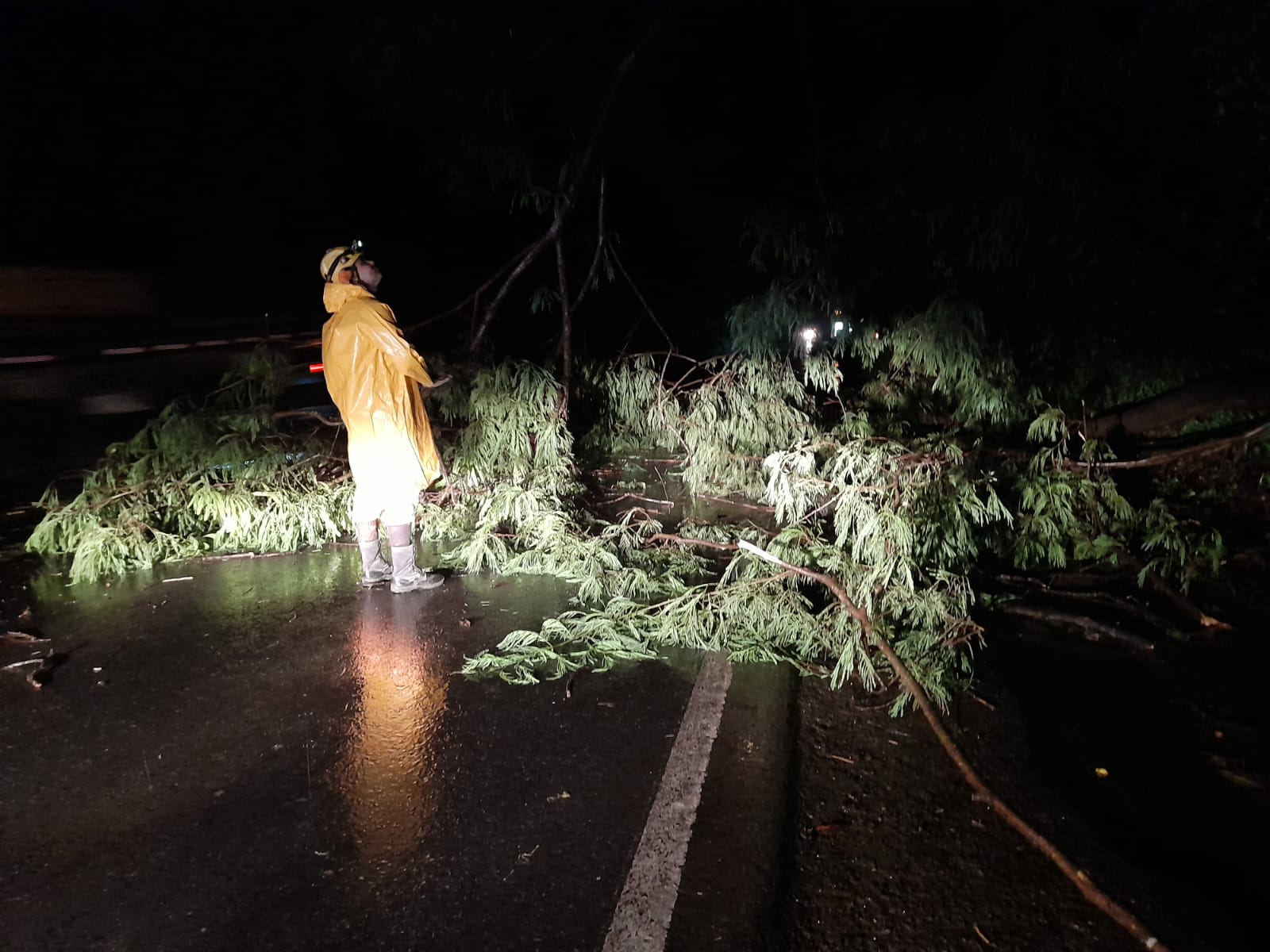 A queda foi provocada pela forte chuva que atingiu a região e causou bloqueio parcial da via. No momento da chegada da guarnição, o solicitante já realizava a sinalização preventiva, contribuindo para a segurança dos motoristas que trafegavam pelo trecho.