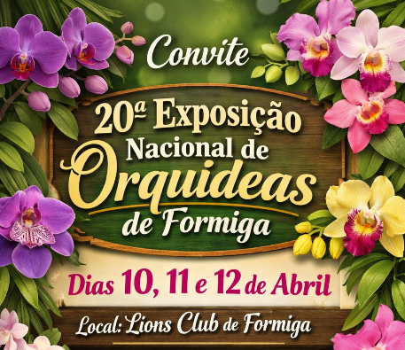 A Associação Formiguense de Orquidófilos (AFOR) realiza, entre os dias 10, 11 e 12 de abril de 2026, a 20ª Exposição Nacional de Orquídeas de Formiga. O evento acontecerá no Lions Clube de Formiga, localizado na rua Seis de Junho, nº 193, no Centro da cidade.