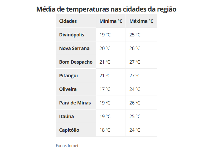 Veja abaixo as temperaturas mínimas e máximas previstas para os próximos dias nas principais cidades da região: