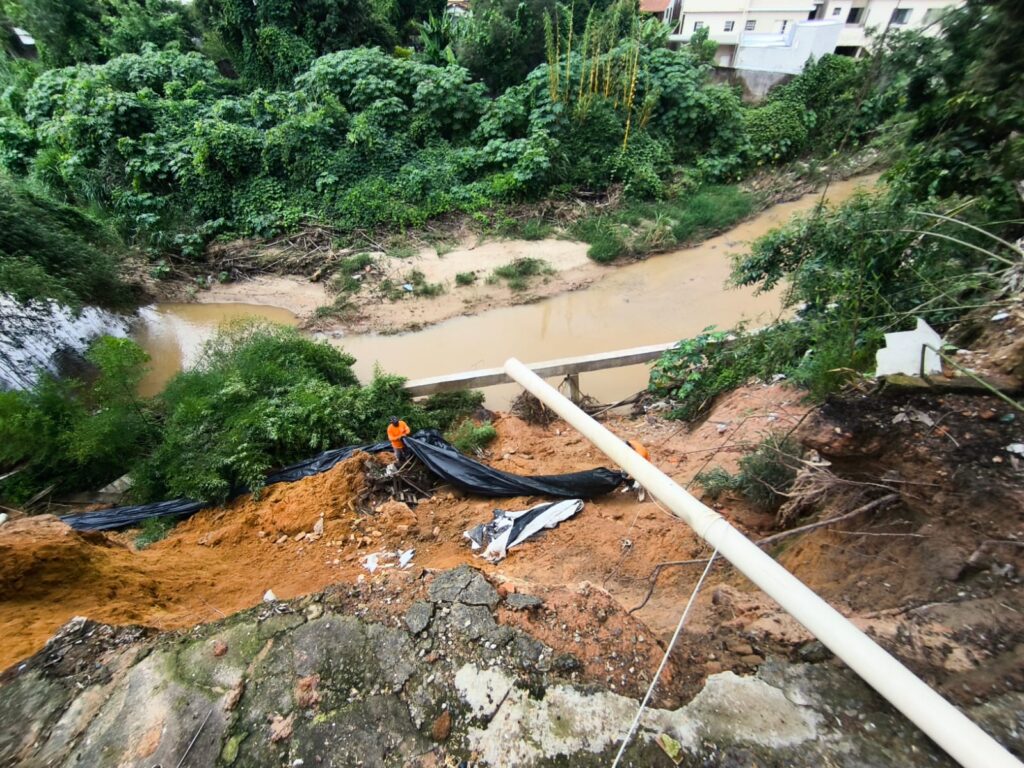 Durante os trabalhos, foram realizados ajustes no talude para melhorar o escoamento das águas pluviais, além da instalação de uma lona plástica de aproximadamente 60 metros por 8 metros, destinada à proteção da parte posterior das residências atingidas.
