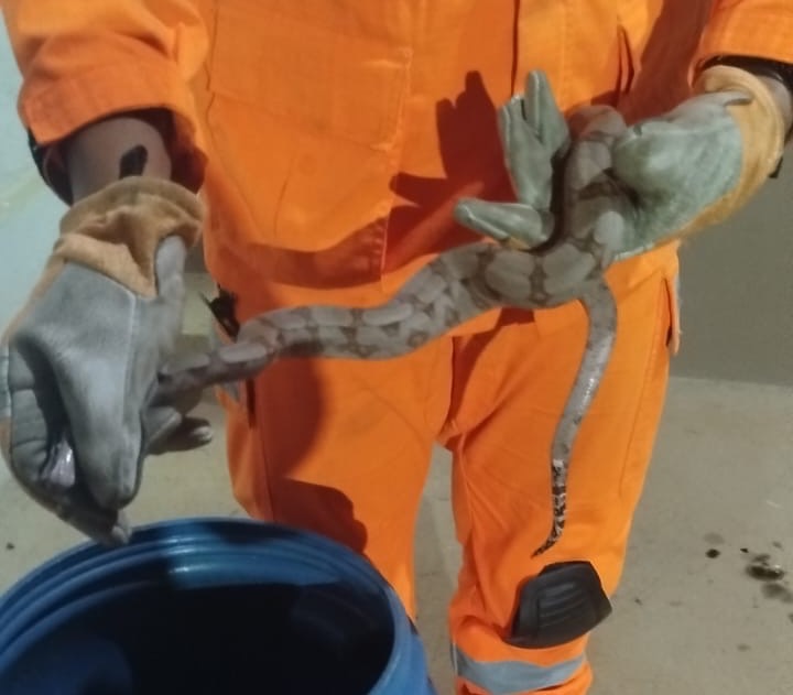 No local, os militares identificaram que se tratava de uma serpente da espécie jiboia. Utilizando técnicas adequadas e equipamentos específicos, como pinças próprias para contenção de répteis, a equipe realizou a captura de forma segura e controlada, sem causar ferimentos ao animal e sem riscos aos moradores.