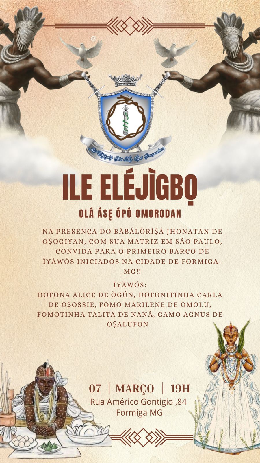 Na presença do Bàbálòrìṣá Jhonatan de Oṣogiyan, será realizado o primeiro barco de Ìyàwós do Ilé Eléjìgbọ Ọlá Àṣẹ Òpó Ọmọrodan na cidade. É a primeira vez que essa casa tradicional promove iniciações em Formiga, marcando oficialmente sua chegada e o início de sua caminhada no município.