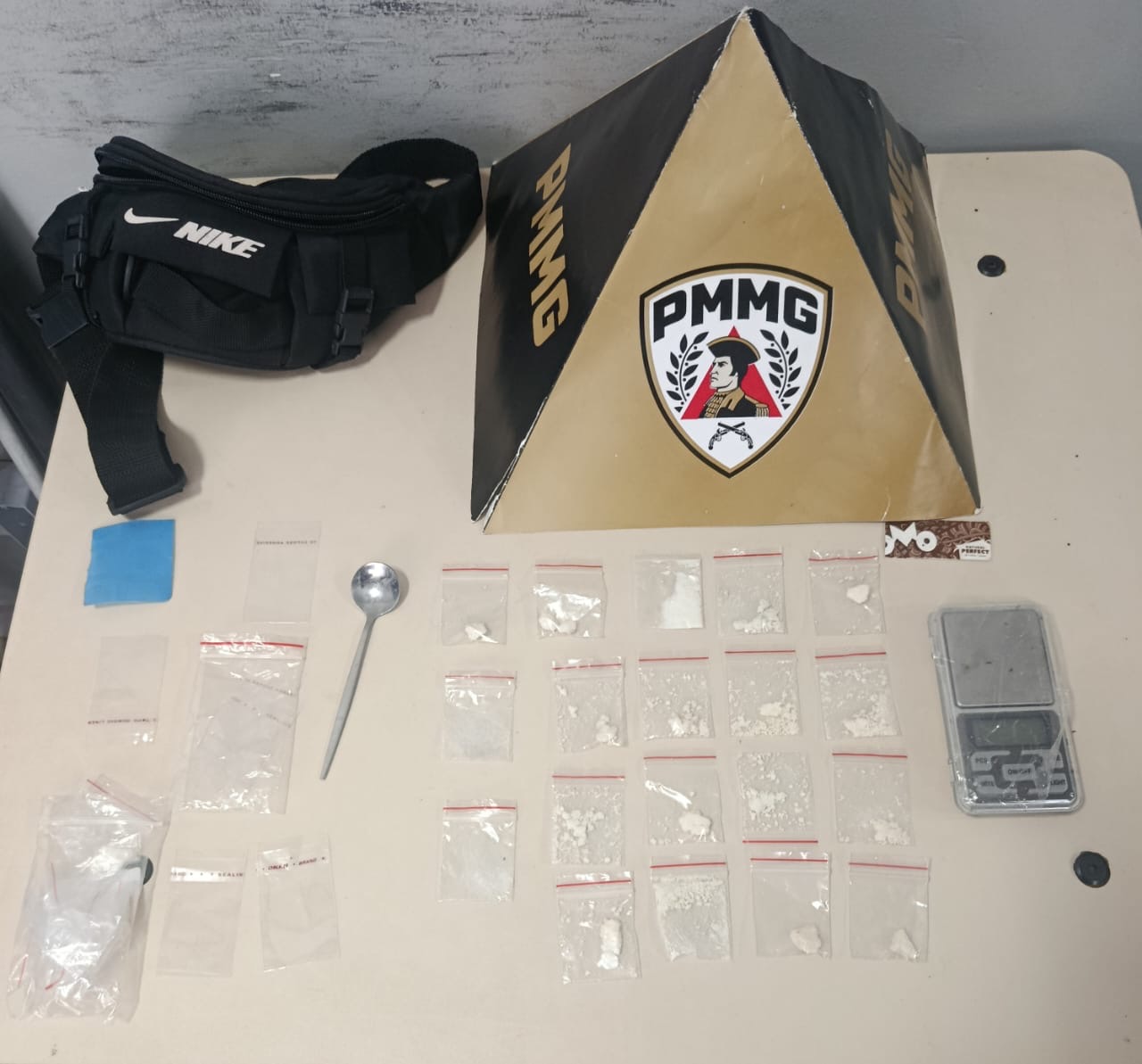 Durante as diligências, os militares localizaram dois autores e uma pochete contendo 17 papelotes de substância análoga à cocaína, além de uma balança de precisão, uma colher metálica e embalagens plásticas utilizadas para o fracionamento de entorpecentes.