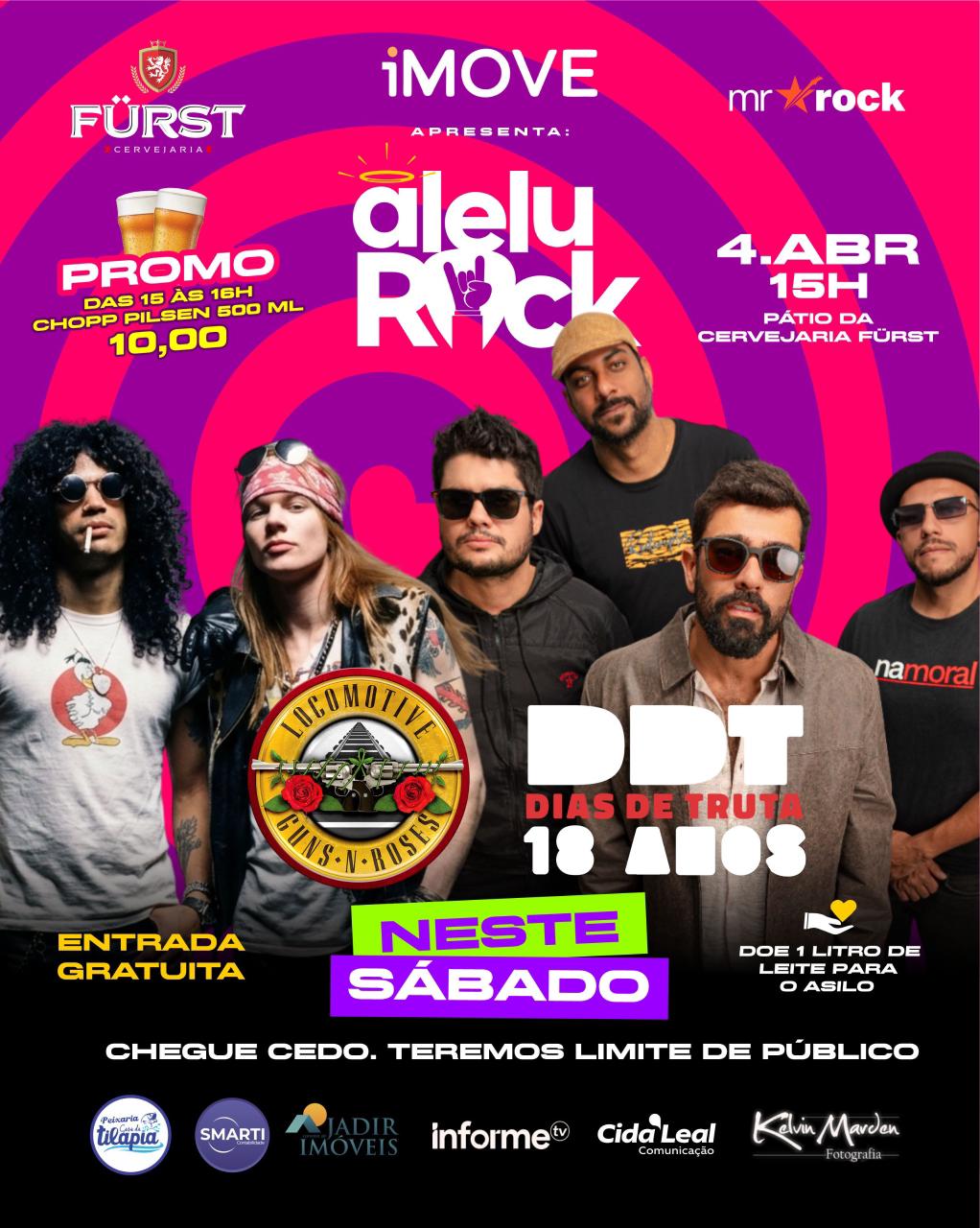 Com entrada gratuita, o público é convidado a contribuir com a doação de 1 litro de leite, que será destinado à instituição. O evento contará com apresentações das bandas Dias de Truta, que celebra 18 anos de história e estrada, e Locomotive Guns, com tributo ao Guns N’ Roses.