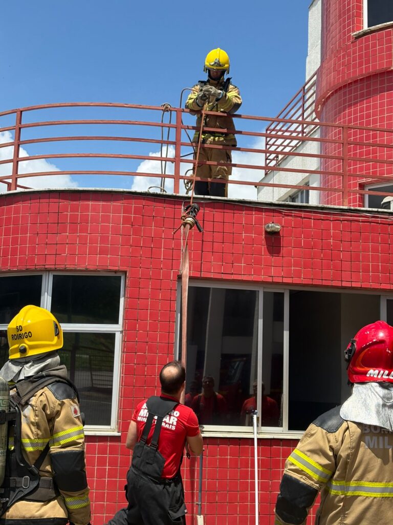 Durante a instrução, foram abordados conteúdos relacionados ao combate a incêndio, com foco na montagem de estabelecimento em edificações verticais. A atividade contemplou aula teórico-prática sobre diferentes formas de estabelecimento, incluindo sistema de hidrante predial, recalque pelo hidrante de recalque (HR), recalque pelo primeiro hidrante interno (HI), içamento de ligação e linha, bem como estabelecimento pela caixa de escada.