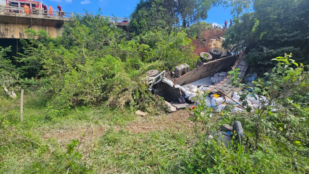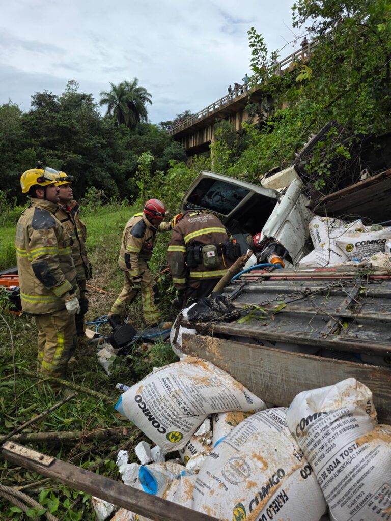 No local, as equipes de resgate constataram que o caminhão havia capotado em uma ribanceira de aproximadamente 15 metros, às margens do Rio Formiga. A cabine do veículo encontrava-se severamente compactada devido ao peso do próprio caminhão e da carga de sacas de soja, deixando o condutor, um homem de 22 anos, preso às ferragens. A vítima estava consciente, orientada e queixava-se de dores nas pernas e nas costas.