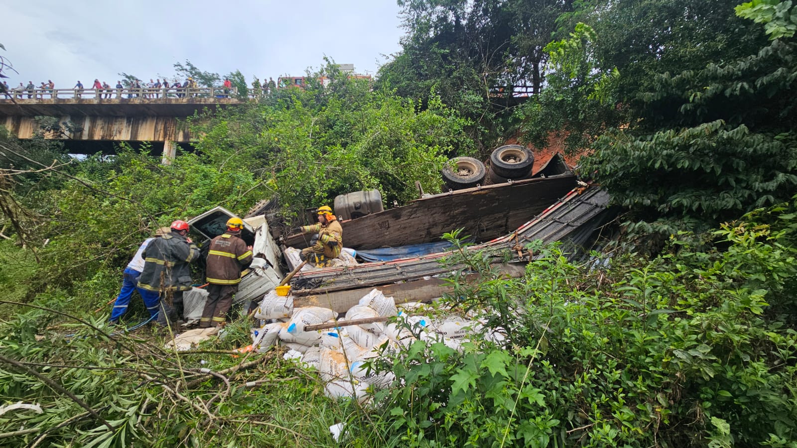 No local, as equipes de resgate constataram que o caminhão havia capotado em uma ribanceira de aproximadamente 15 metros, às margens do Rio Formiga. A cabine do veículo encontrava-se severamente compactada devido ao peso do próprio caminhão e da carga de sacas de soja, deixando o condutor, um homem de 22 anos, preso às ferragens. A vítima estava consciente, orientada e queixava-se de dores nas pernas e nas costas.