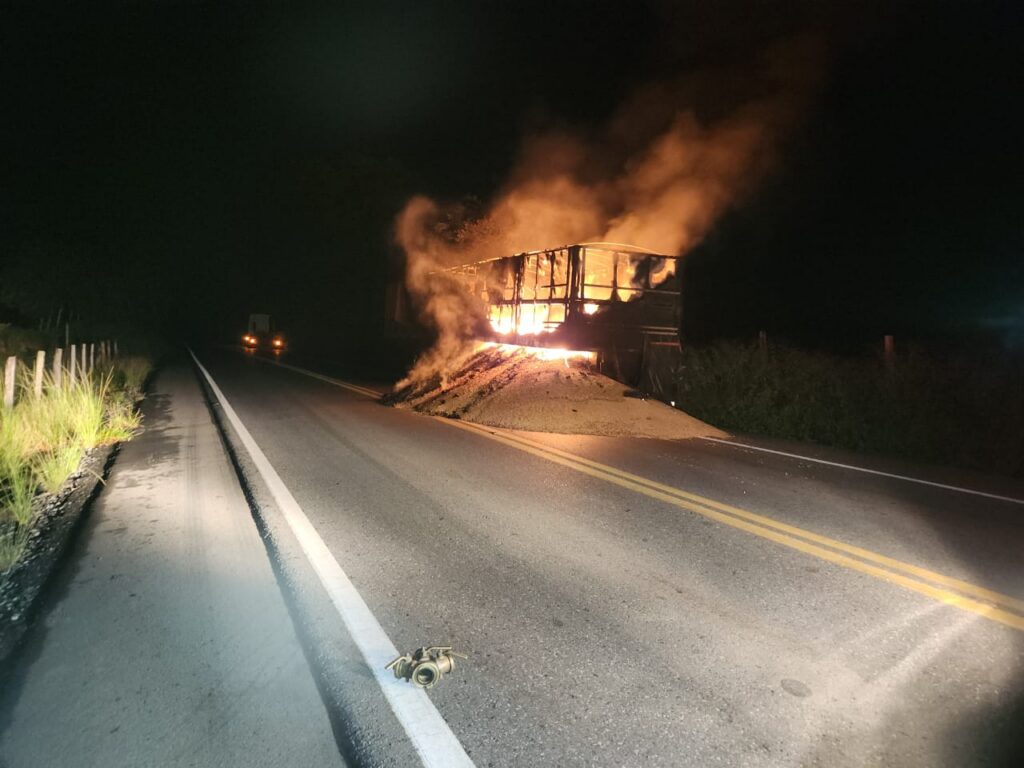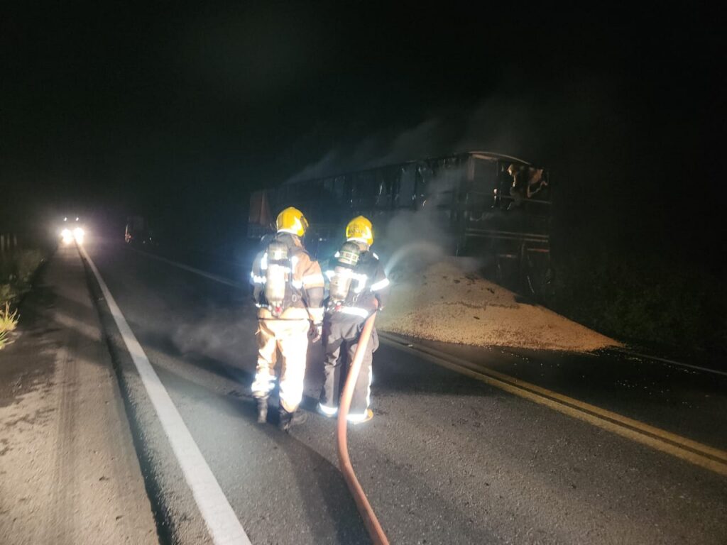 No local, os militares constataram que uma carreta carregada com soja apresentava incêndio concentrado na parte traseira do semirreboque, atingindo tanto a carga quanto a estrutura do implemento. O cavalo mecânico já havia sido desengatado pelo próprio condutor, ação que contribuiu para evitar que o fogo se propagasse para toda a composição do veículo.