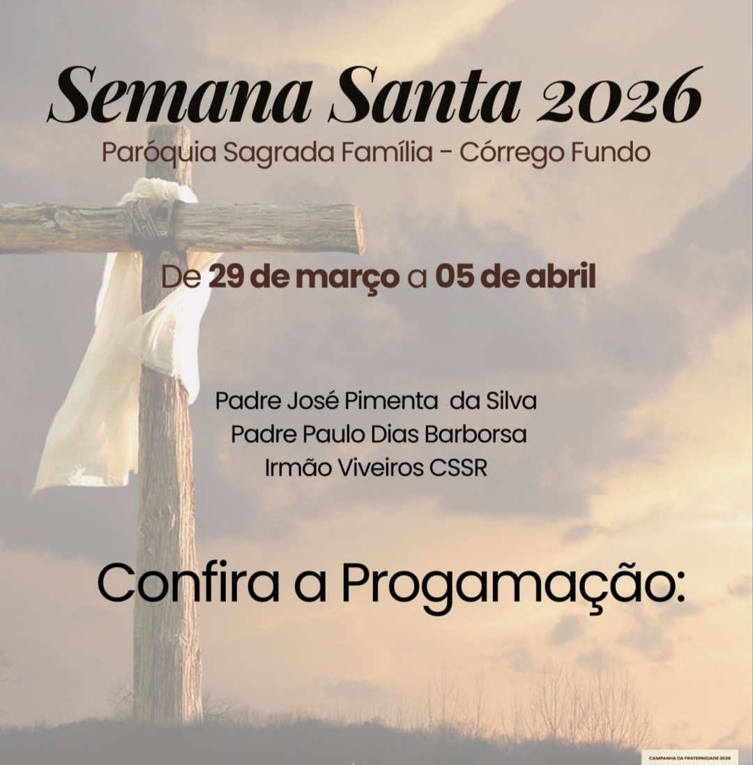 ​A Paróquia Sagrada Família, em Córrego Fundo (MG), divulgou o cronograma oficial de celebrações para a Semana Santa de 2026. As atividades envolvem a Igreja Matriz, a Comunidade de Córrego Fundo de Baixo e outras localidades, proporcionando momentos de oração e reflexão entre os dias 29 de março e 5 de abril.