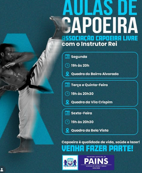 A Prefeitura Municipal de Pains, por meio da Secretaria de Cultura e Turismo, está promovendo uma importante iniciativa de incentivo ao esporte e à preservação cultural: as aulas de capoeira da Associação Capoeira Livre. Sob a coordenação do Instrutor Rei, o projeto busca levar qualidade de vida, saúde e lazer para a população, utilizando o movimento e a energia da capoeira como ferramentas de transformação social.