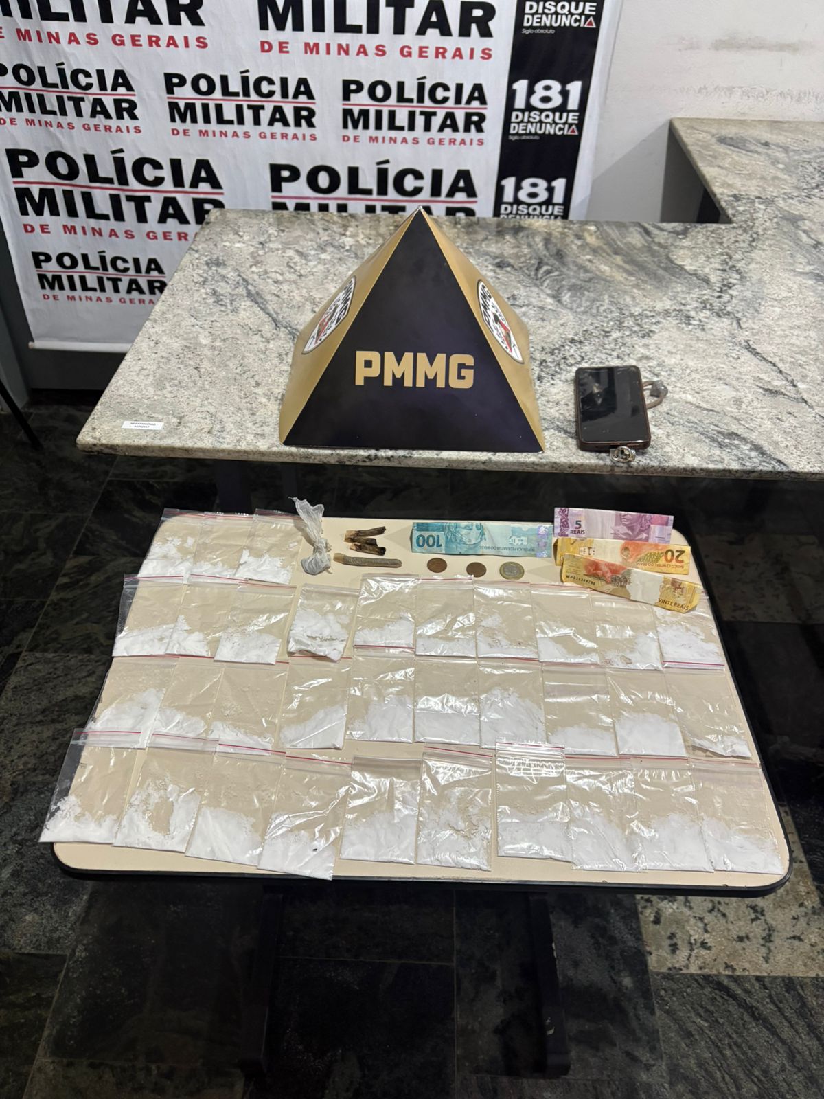 Com ele, os militares encontraram um papelote de cocaína e uma porção de maconha que havia sido jogada no chão. Diante da forte suspeita de que a droga vinha daquela casa, os policiais entraram no imóvel, onde foram recebidos pela moradora. Durante as buscas na residência, a equipe localizou uma bolsa que guardava 32 papelotes de cocaína — embalados exatamente como a droga do primeiro abordado — além de R$ 126,10 em dinheiro.