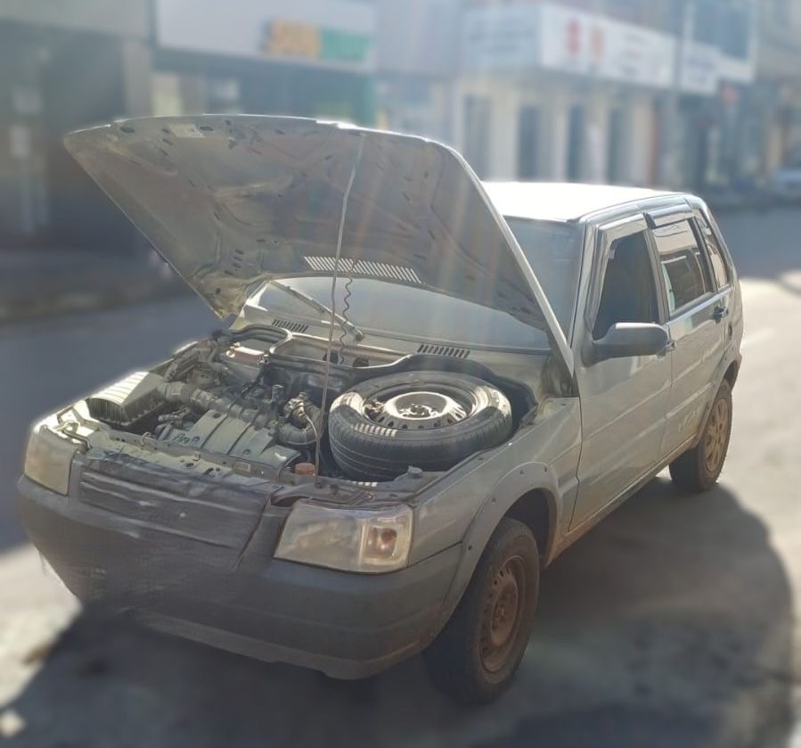 O veículo, um Fiat Uno Mille Way Econ, de cor cinza, ano 2009, foi estacionado na lateral da rua e permaneceu com o capô aberto após o incidente.