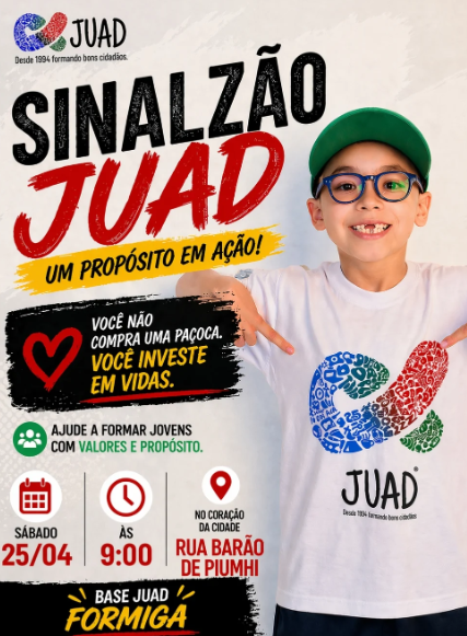 A Base JUAD de Formiga realizará, neste sábado, 25 de abril de 2026, a primeira edição do “Sinalzão JUAD”. A iniciativa ocorrerá a partir das 09:00, na Rua Barão de Piumhi;